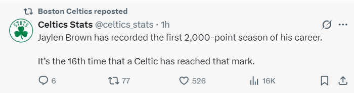 这场比赛是布朗的里程碑夜晚,他达成了单赛季2000分,也是绿凯队史第16次单赛季2000分的纪录。