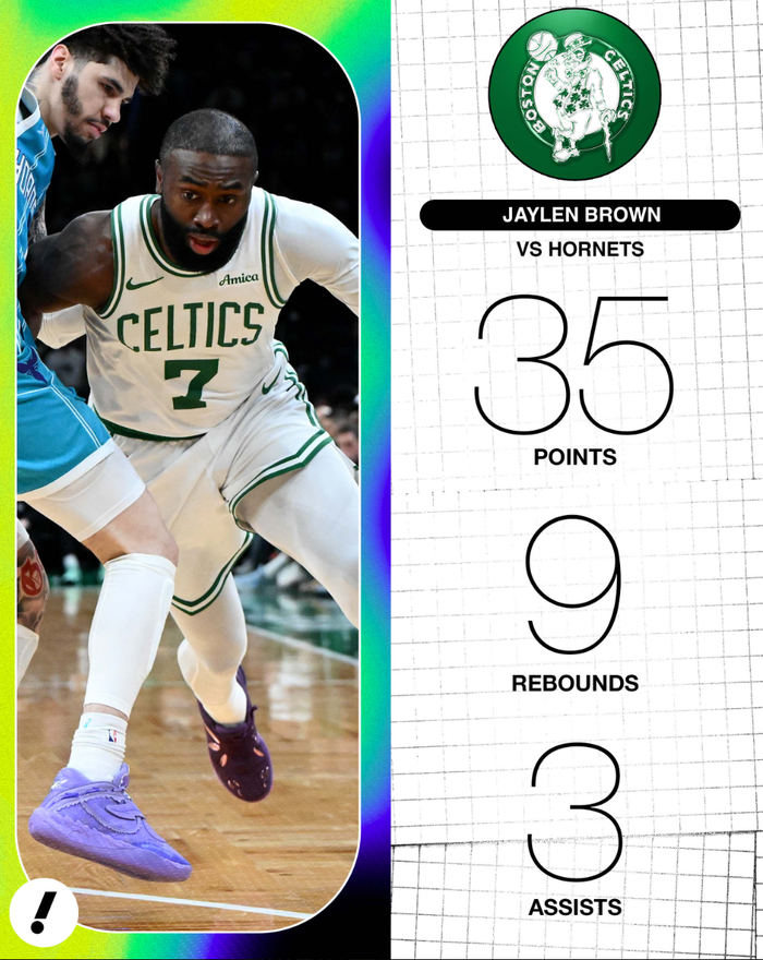 北京时间4月8日,NBA常规赛,凯尔特人113-102大胜黄蜂拿到四连胜,这场比赛后绿凯与东部第三的尼克斯已经拉开3个胜场。黄蜂核心拉梅洛-鲍尔狂揽36分6助攻5篮板6三分也无力回天,因为绿凯的双探花实在是太强悍,尤其是杰伦-布朗,本赛季的布朗打出MVP的风采。