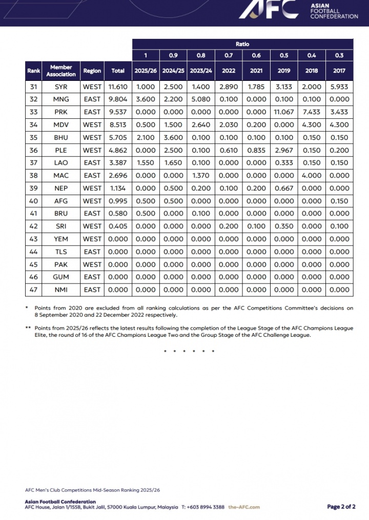 2025/2026赛季亚足联男子俱乐部赛事中期排名榜(前10):