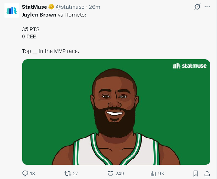 塔图姆此役39分钟,15中8,三分7中3,罚球5中4,拿到23分5篮板4助攻1抢断,命中率53.3%,三分命中率42.9%,真实命中率66.9%,他本赛季复出的15场比赛绿凯赢下其中的13场。他的复出让布朗剑指最佳一阵。