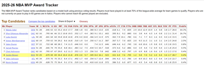 本赛季布朗场均34.5分钟,拿到28.8分7篮板5.2助攻1抢断0.4盖帽,他帮助绿凯屹立东部第二,他在MVP榜单上排在第八的位置,本赛季有多位球星无缘65场规则无法评奖,布朗入选最佳一阵看上去已经板上钉钉。